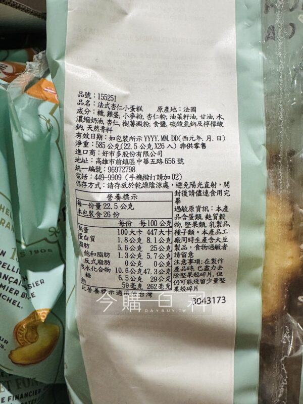 產地:法國,口感濕潤鬆軟,杏仁粉含量14%,每顆獨立包裝。