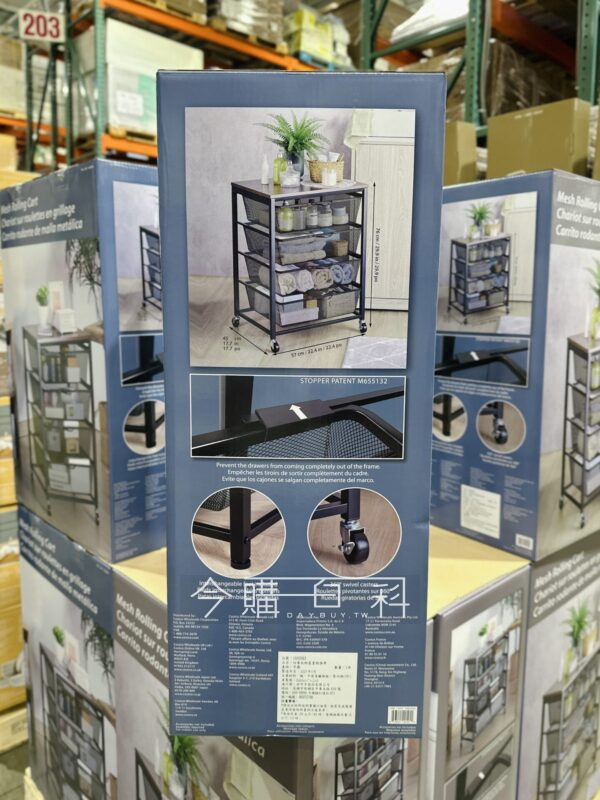 可鎖式輪腳,提供高度穩固,四層收納籃可分頪擺放物品,抽屜式設計,方便取物,每個抽屜承重約6公斤,桌面承重約20公斤,附抽屜卡扣,防止抽屜滑落。