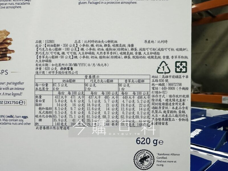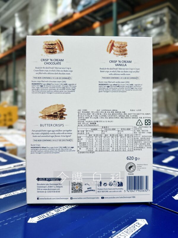 經典奶油鬆餅乳香十足,薄脆口感讓人一口接一口,另外全新兩款夾心餅乾:巧克力口味及香草口味,濃郁內餡一口滿足,產地:比利時。