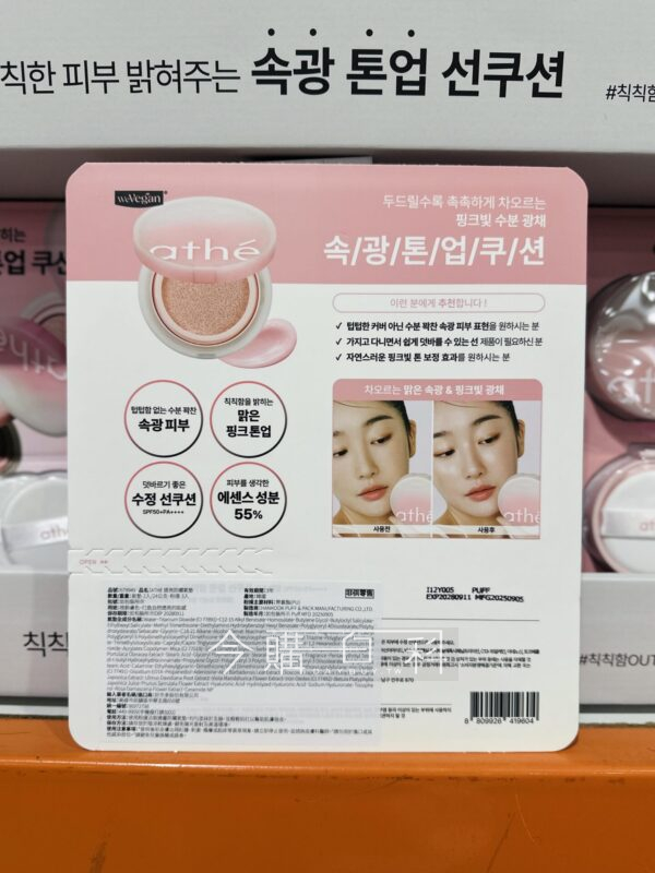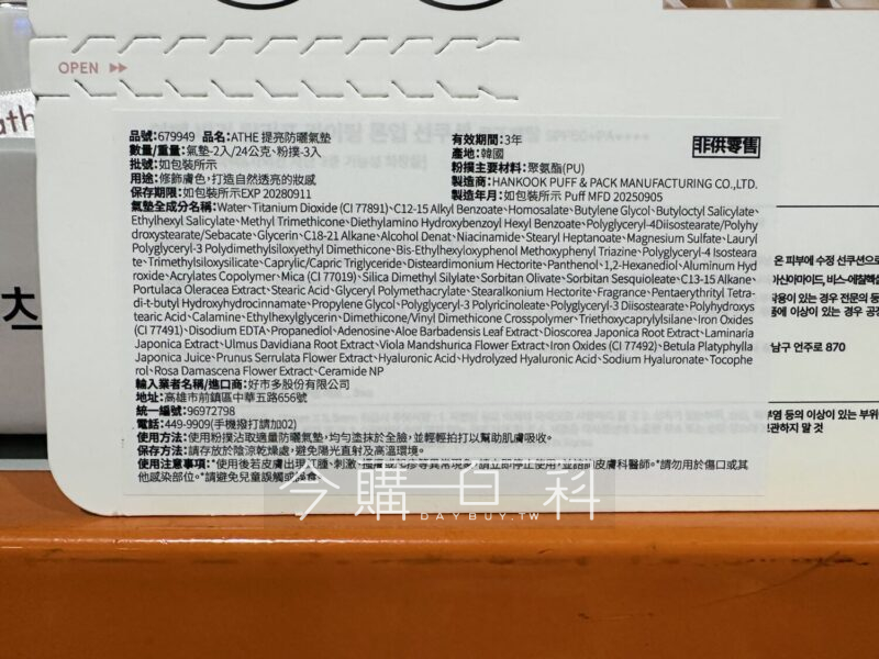 韓國製造,含55%護膚成分,補光補水,亮膚防曬,SPF50+ PA++++,使用不結塊,不暗沉,氣墊+補充+粉撲*3。