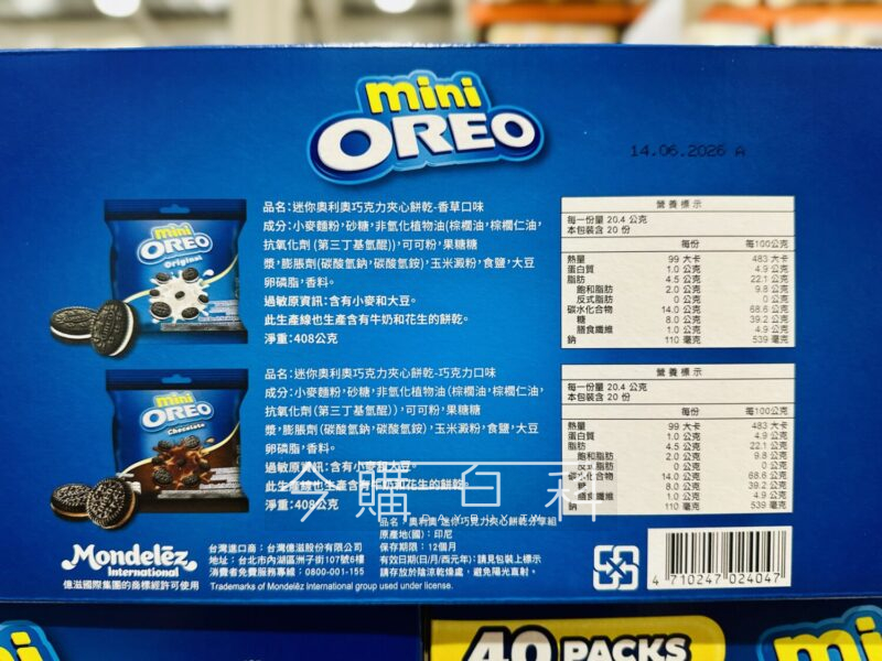 OREO迷你分享包輕巧方便,兩種口味一次滿足,巧克力口味20包,香草口味20包,烘焙甜點、冰品裝飾好選擇,適合外出攜帶或搭配下午茶。