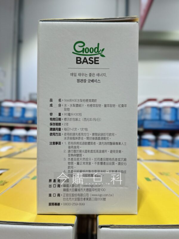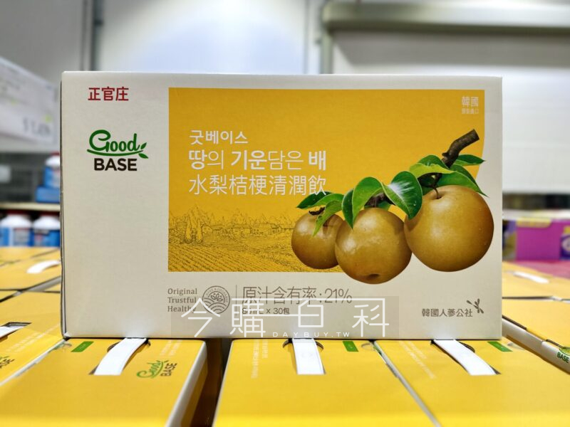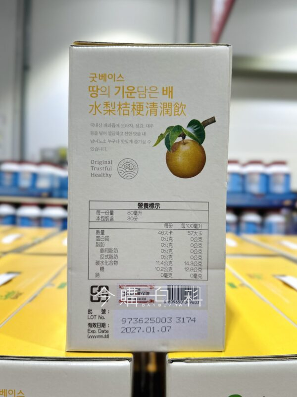 添加水梨濃縮汁、薑萃取物及桔梗萃取物和紅棗萃取物,潤喉、調節生理機能,營養補給、健康維持,不添加人工甜味劑及香料,鋁箔包設計,方便即飲,原產地:韓國。