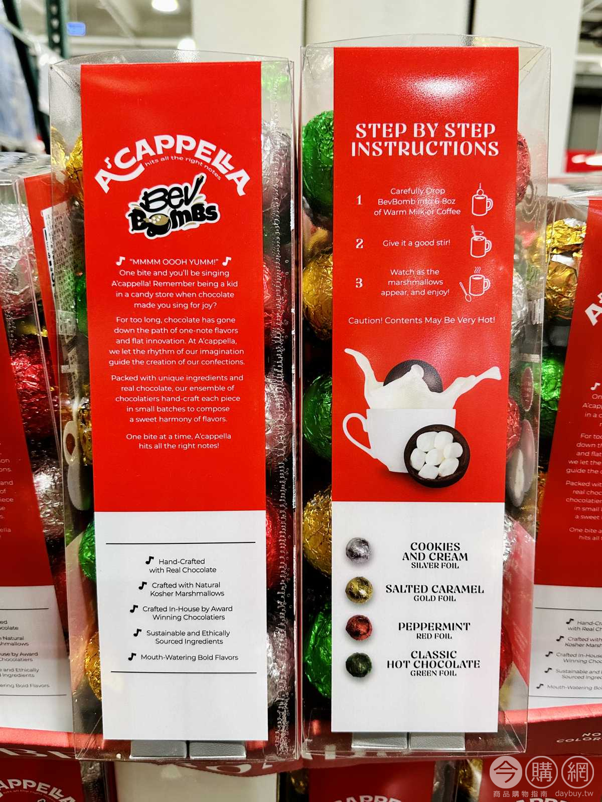 為派對聚會帶來有趣驚喜,將一顆巧克力球放入馬克杯,沖入熱牛奶融化外層巧克力,迷你棉花糖會迸出漂浮杯面,原味、薄荷、焦糖以及巧酥餅乾共4種不同風味,簡單沖泡美味熱巧克力。
