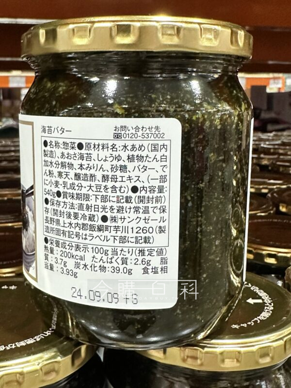 以愛知縣青海苔與奶油、醬油調製而成,無化學調味料、無增稠劑、著色劑,可佐飯熱粥或作為飯糰與三明治內餡調味,原產地:日本長野縣。