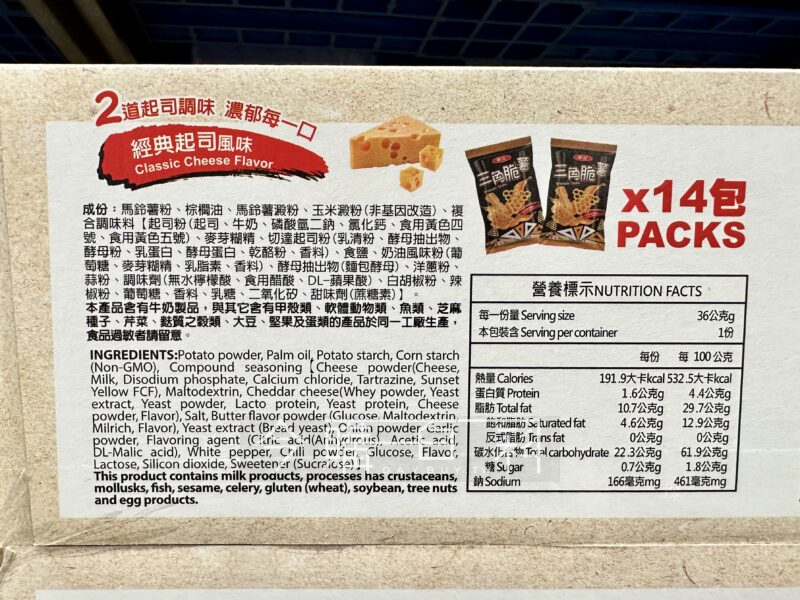 獨特三角形餅體,爽脆口感,經典起司、醬燒海苔風味,2種口味各14包。