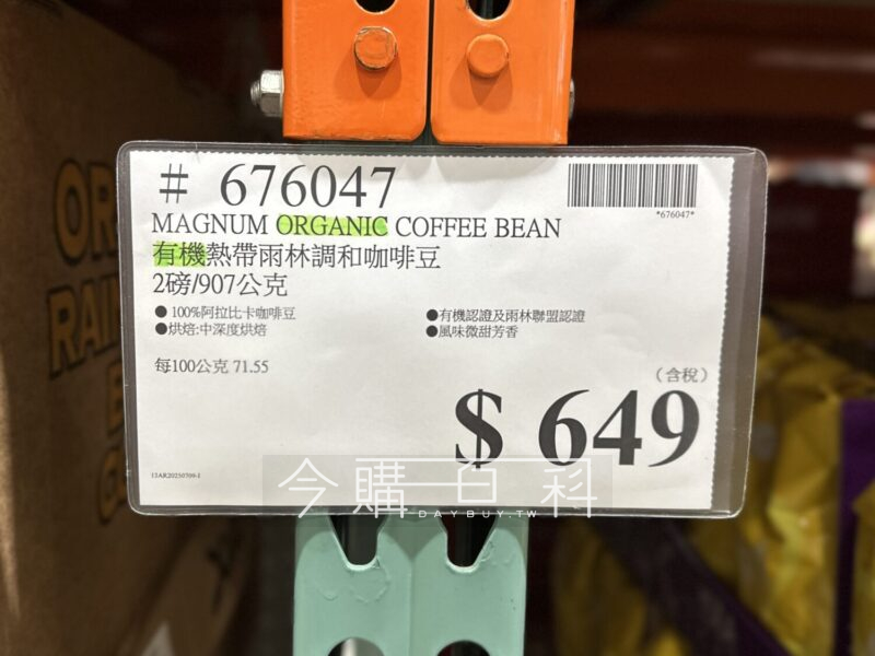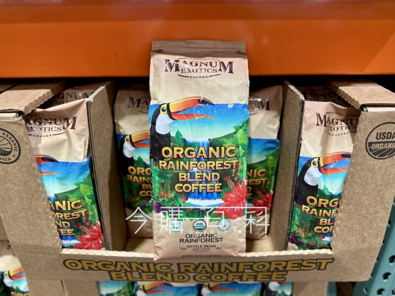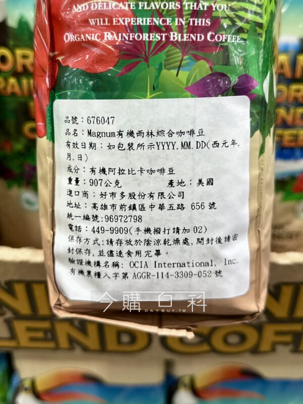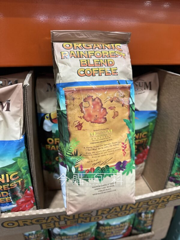 100%阿拉比卡咖啡豆,烘焙:中深度烘焙,有機認證及雨林聯盟認證,風味微甜芳香。