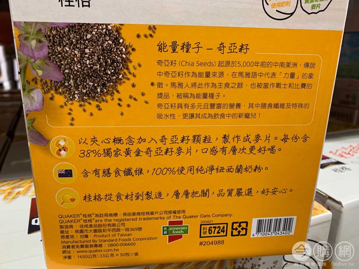 創新製程製作,加入奇亞籽,吃得到加厚麥片,更好喝的三合一麥片。每份含38%黃金奇亞籽麥片,口感豐富有層次。含膳食性纖維,100%使用奶粉。