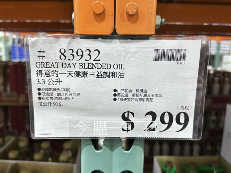 發煙點攝氏220度,低油煙、適合煎煮炒炸,脂肪酸健康比例4:8:1,由芥花油、橄欖油、葵花油、葡萄籽油及玉米油5種好油調配。