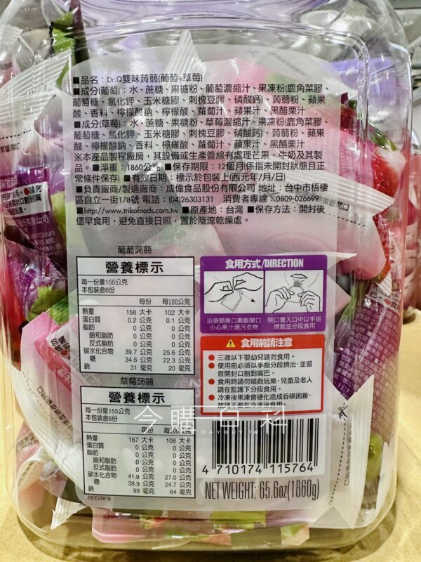 兩種口味:葡萄、草莓,清甜爽口甜而不膩,氣密度高創新獨立迷你包,透明罐裝方便取用與儲藏。