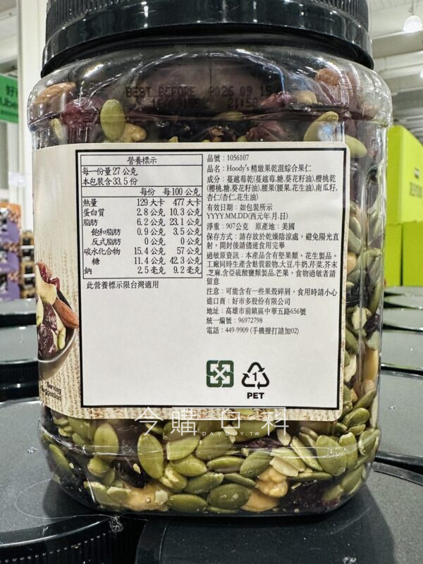 不添加鹽的混合果乾果仁,內含蔓越莓乾、櫻桃乾、腰果、南瓜籽及杏仁,可當點心直接食用,不添加任何的人工添加劑,原產地:美國。