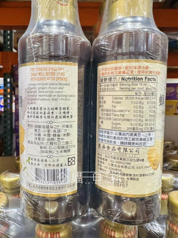 天然釀造醬油及純蜂蜜調製,純蜂蜜加上淡淡的薑蒜香,燒烤、熱炒、醃製皆適用,不含防腐劑、味精,不含人工色素。