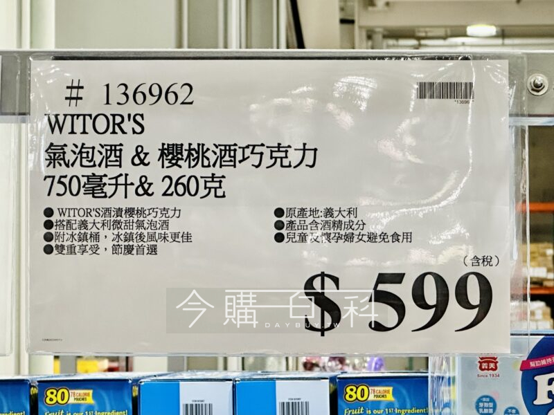 WITOR’S酒漬櫻桃巧克力,搭配義大利微甜氣泡酒,附冰鎮桶,冰鎮後風味更佳,雙重享受,節慶首選,產品含酒精成分,兒童及懷孕婦女避免食用。