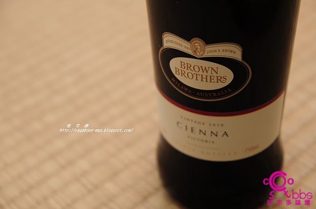 [align=left]2. Brown Brothers Cienna是帶有點腰身的瓶裝,裡面裝滿寳石紅的酒色~[/align]