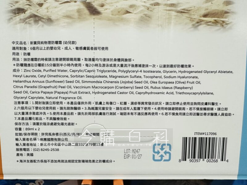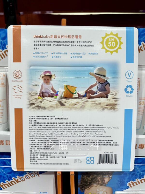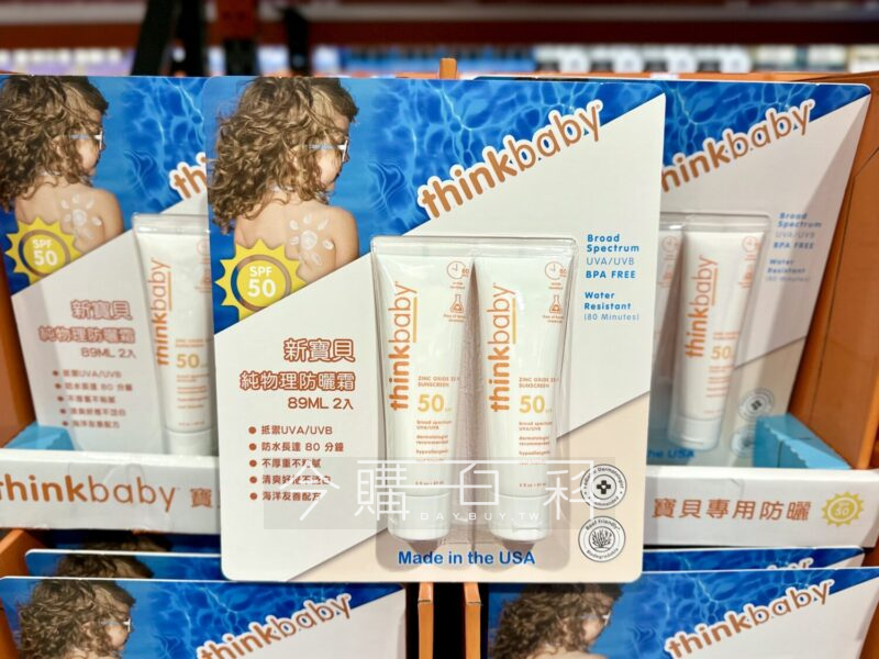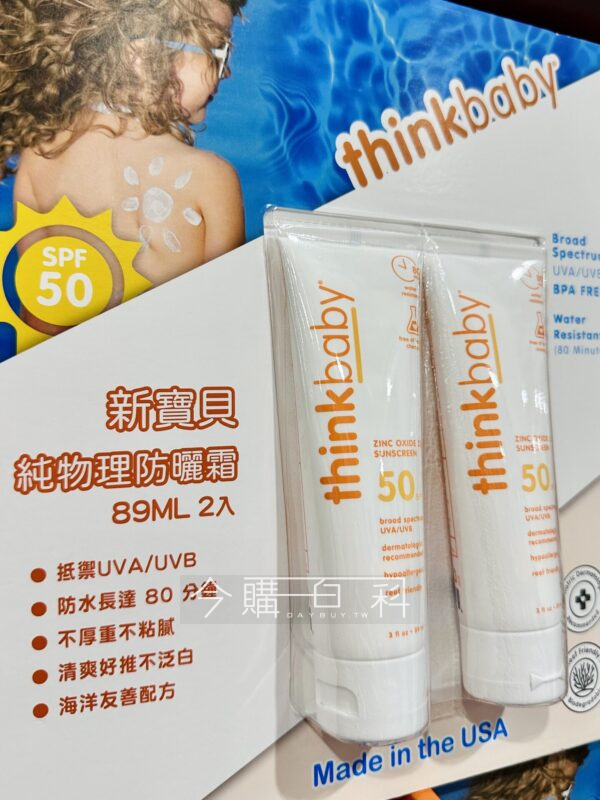 使用物理成分,使用安心,不黏稠、不油膩、不泛白,可輕鬆推開不留痕跡,高效防護UVB SPF50+,可防水,美國製造。