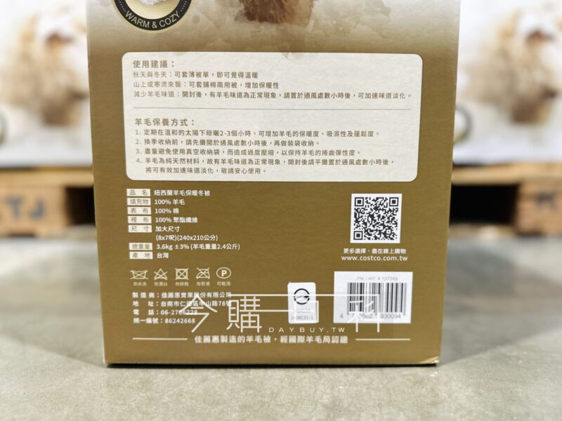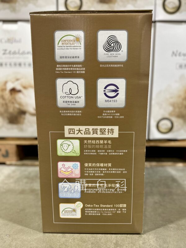 100%紐西蘭天然羊毛,一面100%美國棉表布,一面磨毛壓花纖維親膚表布,品質細緻,蓬鬆柔軟,本產品獲國際環保紡織標章,羊毛經專業清潔處理程序,羊毛填充重量2.4公斤。