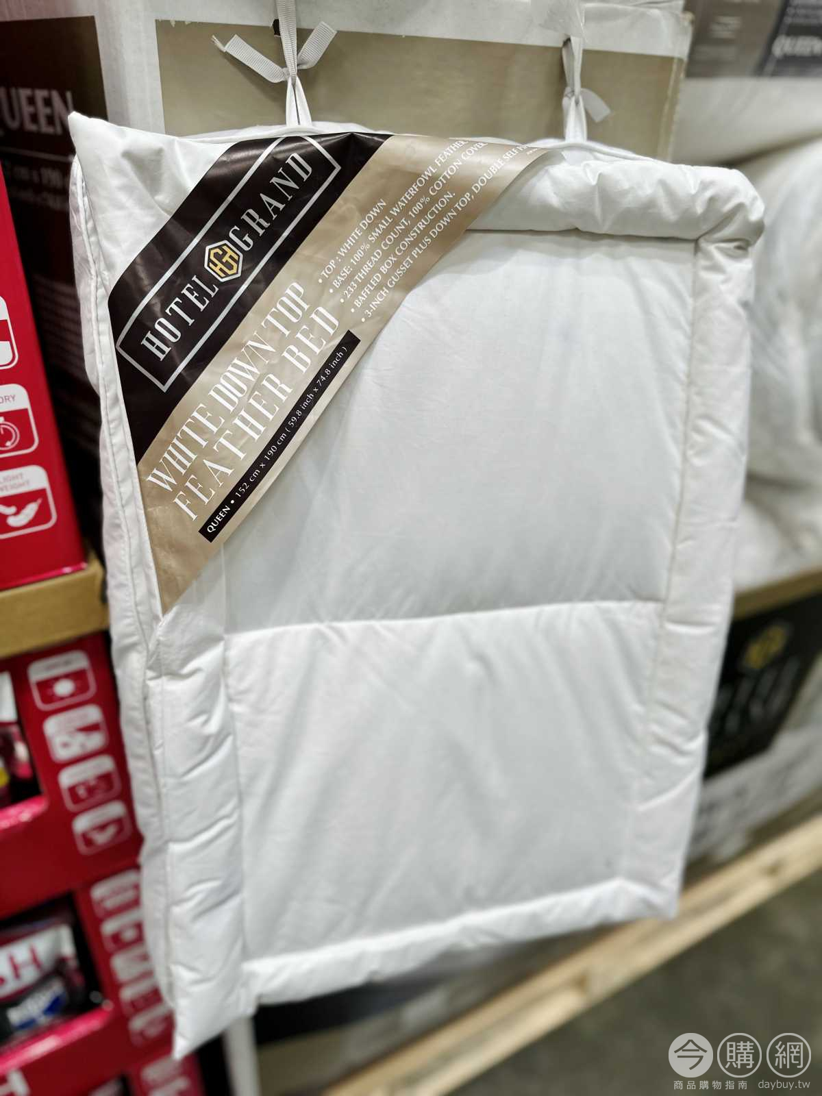 純棉233織表布親膚質感,上層75%白羽絨25%羽毛,下層填充100%羽毛,保暖舒適,床墊高度約7公分,精緻車縫技巧結構紮實,對羽絨過敏者不建議使用,清潔說明請詳見中文標示。