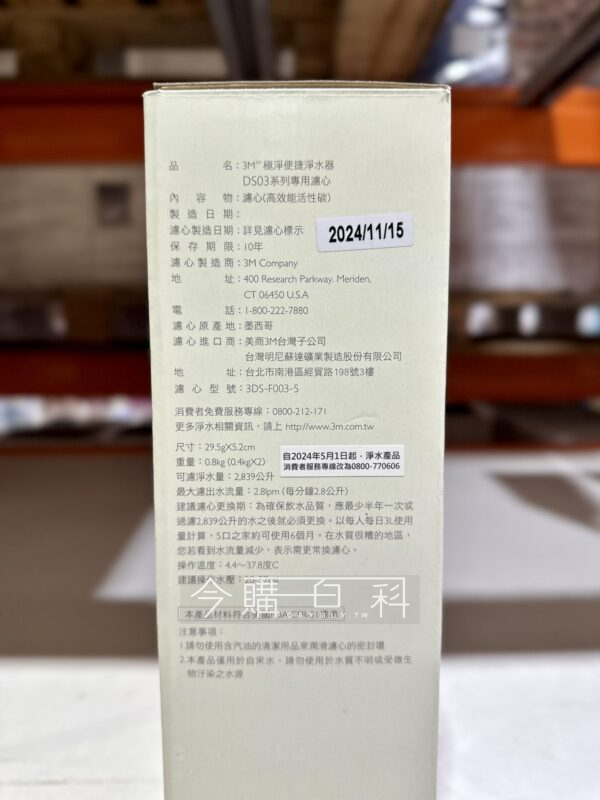 通過NSF 42/53號認證,可去除水中餘氯、異味、鐵鏽、鉛、VOC及效質,可去除水中99.5%孢子,VOC=揮發性有機化合物,每支濾心淨水量2839公升,建議至少每半年更換濾心。