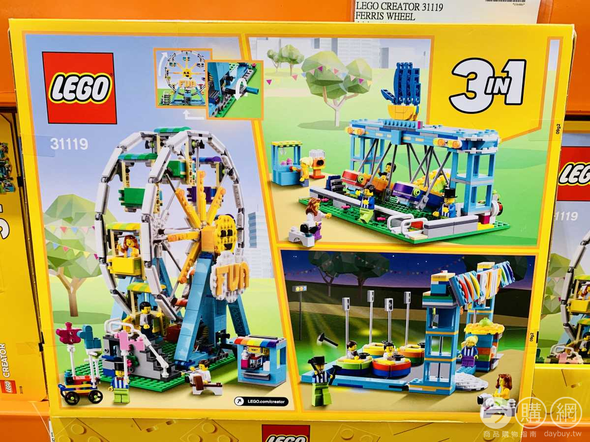 一套盒組3種拼搭選項,摩天輪、碰碰車、搖搖船,摩天輪共8個車廂,轉動輪軸可讓摩天輪旋轉,內含人偶*5,人偶皆可搭乘遊樂設施,共1002件樂高積木,適用年齡:九歲以上。