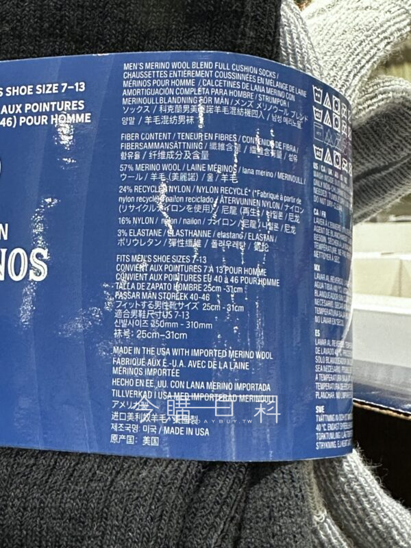 適合鞋碼:7-13,內含57%美麗諾羊毛,40%尼龍以及3%彈性纖維,舒適足部支撐適合訓練穿著,再生尼龍纖維製,環境友善。