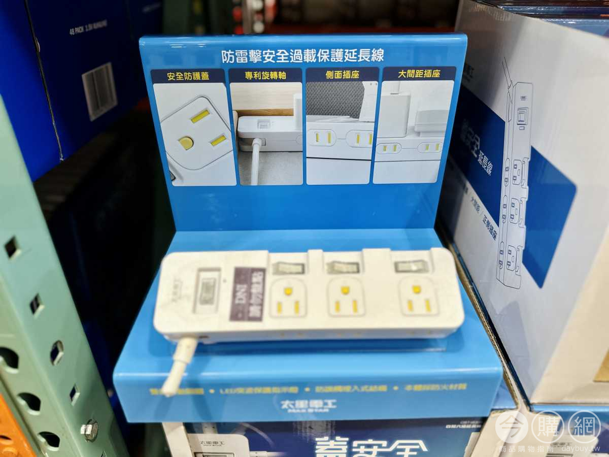 旋轉式電源線設計,插座加大間距設計,安全防護蓋設計,扁平式插頭,附加突波工作LED指示燈,獨立控制節能開關,過載安全保護總開關。