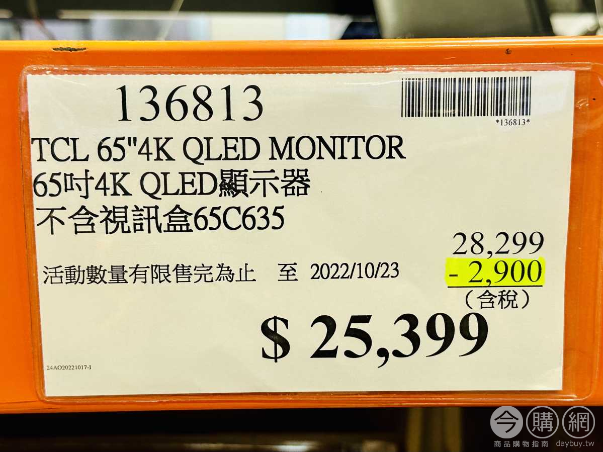 TCL 65吋 4K QLED顯示器 不含視訊盒 #136813 https://www.daybuy.tw/costco/48038/