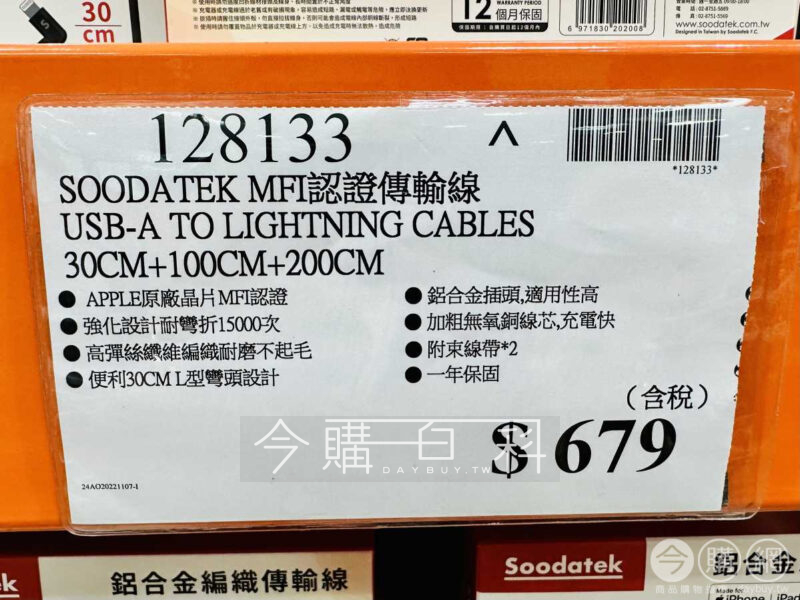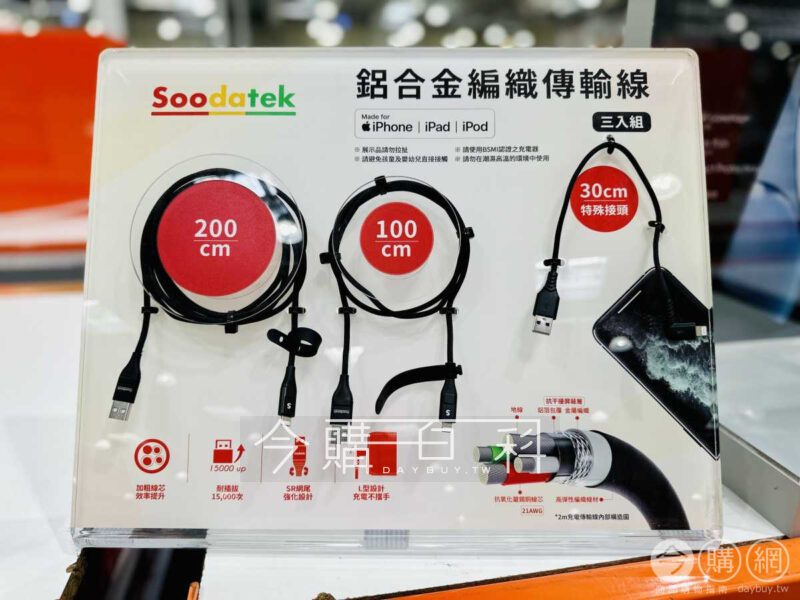 APPLE原廠認證晶片MFI認證,強化設計耐彎折15000次,高彈絲纖維編織耐磨不起毛,便利30CM L型彎頭設計,鋁合金插頭,適用性高,加粗無氧銅線芯,充電快,附束線帶*2,一年保固。