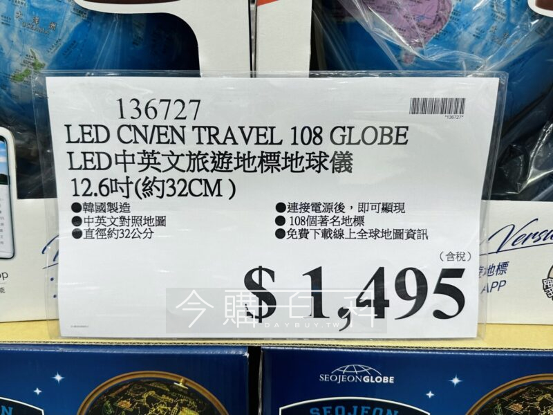 韓國製造,中英文對照地圖,直徑約32公分,連接電源後,即可顯現108個著名地標,免費下載線上全球地圖資訊。