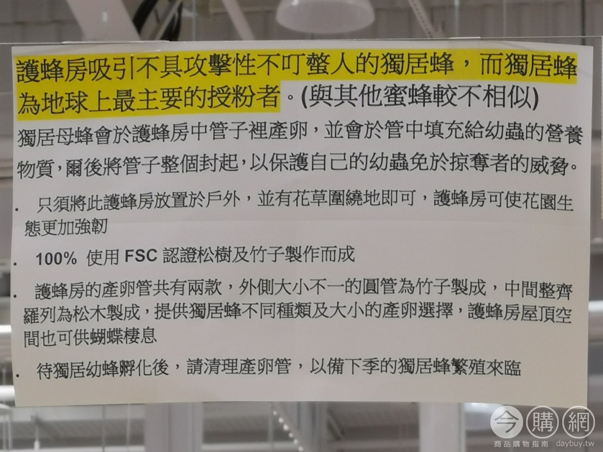 此護蜂房吸引不具攻擊性且不叮螫人的野生蜂,其為地球上最主要的授粉者,將房放於花園中,強靭花園生態,FSC認證松樹及竹子製成,護蜂房屋頂空間也可供蝴蝶棲息。