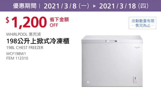 WHIRLPOOL 掀式冷凍櫃198公升 WCF198W1 #112310