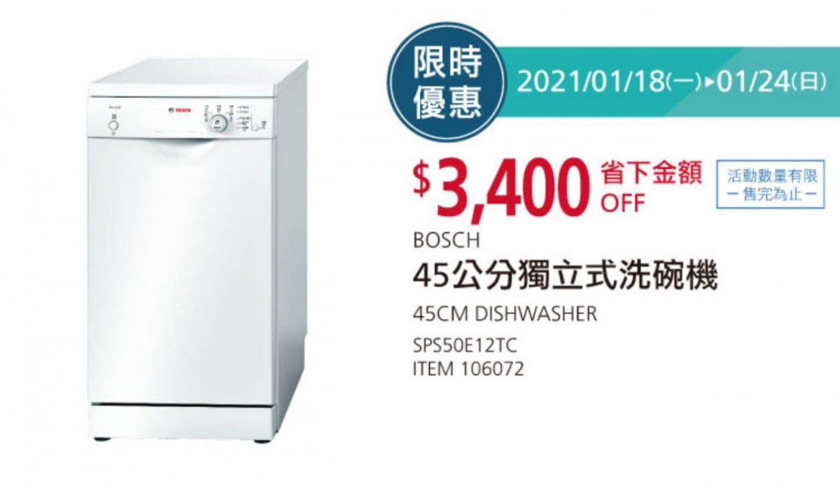 BOSCH 45公分獨立式洗碗機 SPS50E12TC/9人份 #106072