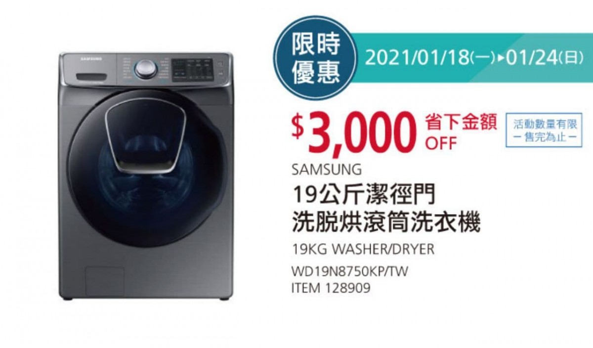 SAMAUNG 19公斤滾筒洗脫烘衣機 #128909