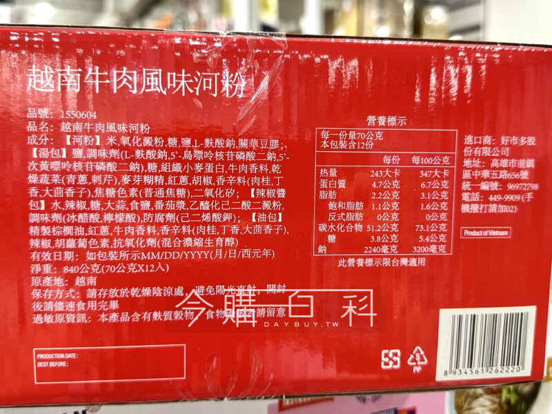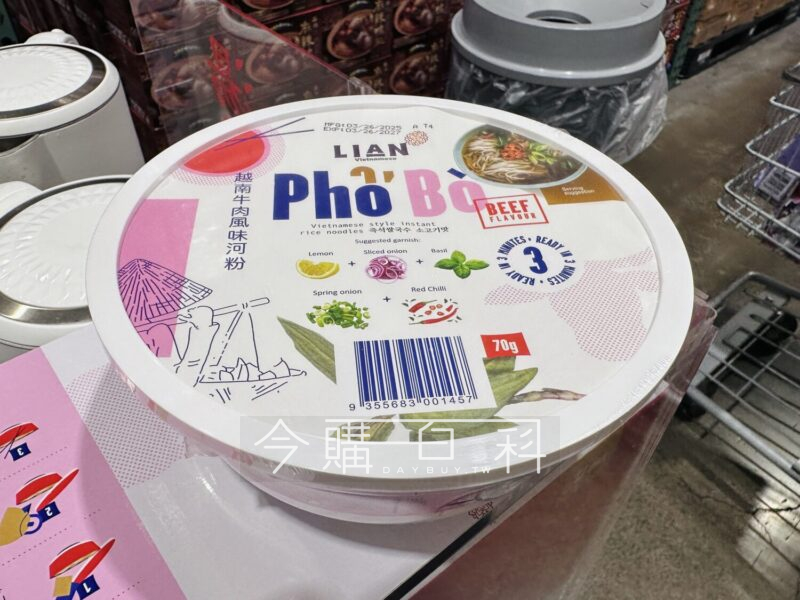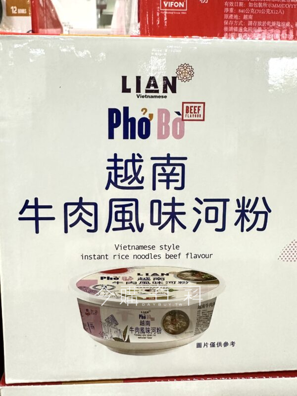 經典越南牛肉風味河粉,熱水沖泡三分鐘即可食用,亦可加入冷水並將上蓋移除以微波爐加熱,每碗熱量243大卡,可依照個人喜好加入檸檬、洋蔥、薄荷葉、蔥花、辣椒等食材。