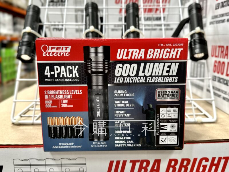 單支尺寸約:直徑3長11.4公分,手電筒皆附3顆AAA電池,滑動式焦距變化,高度:高600低170流明,防水性,耐撞擊,附有腕帶方便使用。