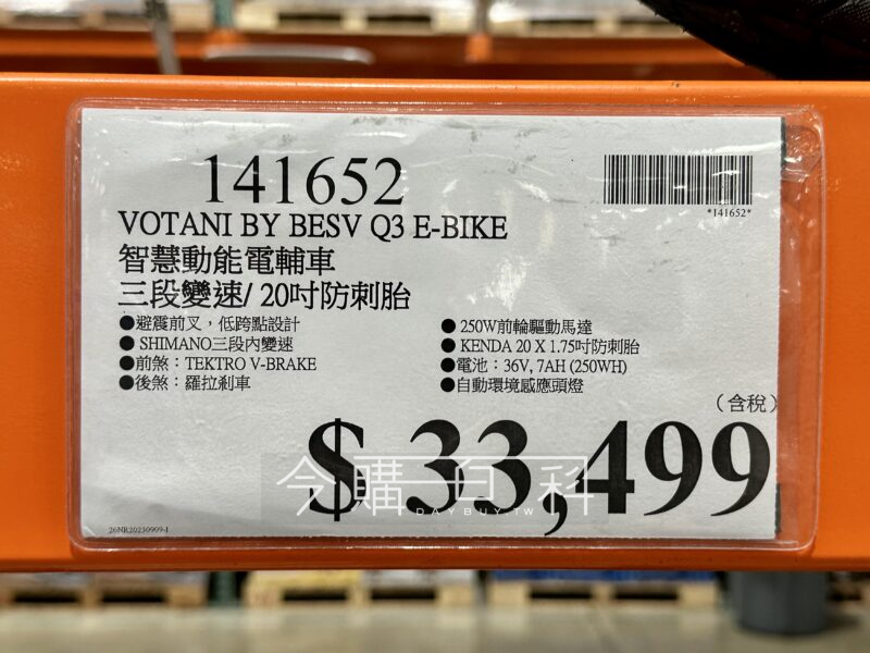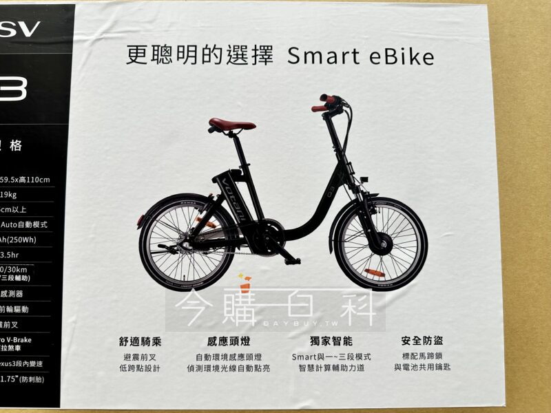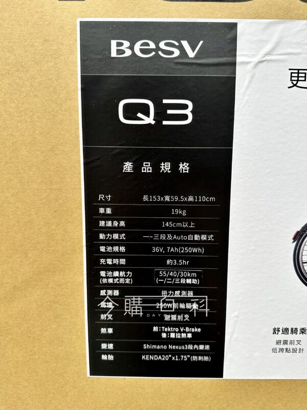 避震前叉,低跨點設計,SHIMANO三段內變速,前煞:TEKTRO V-BRAKE,後煞:羅拉剎車,250W前輪驅動馬達,KENDA 20 X 1.75吋防刺胎,電池:36V,7AH(250WH),自動環境感應頭燈。