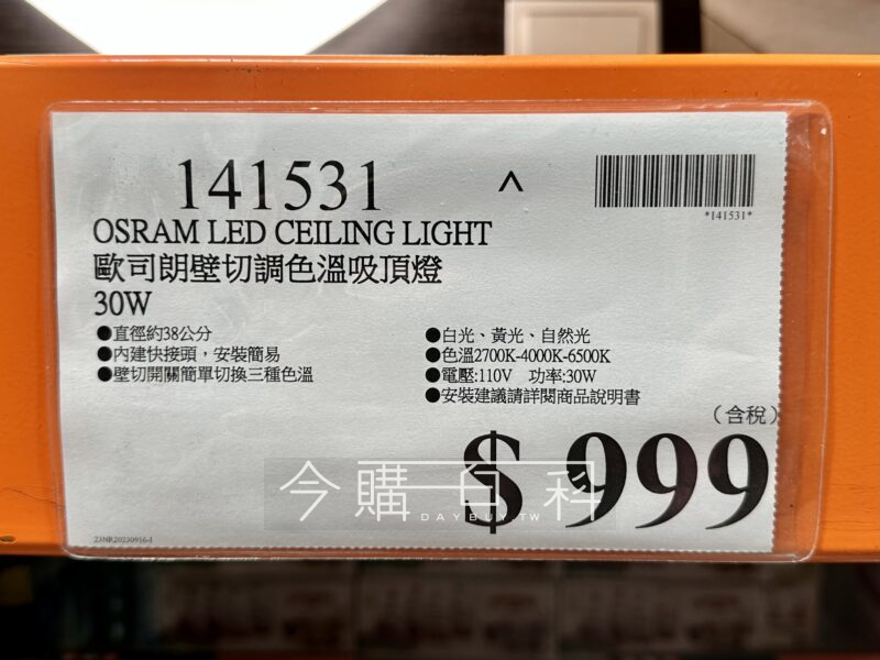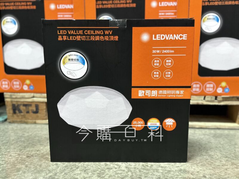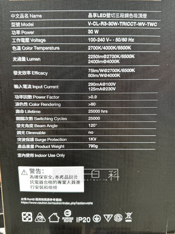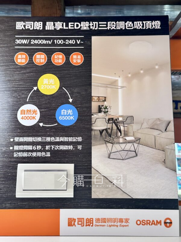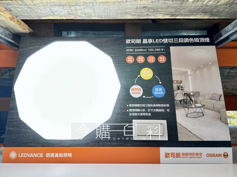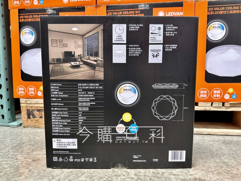 直徑約38公分,內建快接頭,安裝簡易,壁切開關簡單切換三種色溫,白光、黃光、自然光,色溫2700K-4000K-6500K,電壓:110V,功率:30W。