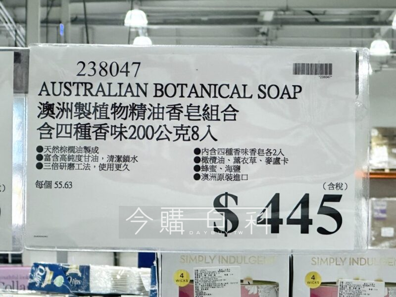 天然棕櫚油製成,富含高純度甘油,清潔鎖水,三倍研磨工法,使用更久,內含四種香味香皂各2入:橄欖油、薰衣草、麥蘆卡蜂蜜、海鹽,澳洲原裝進口。
