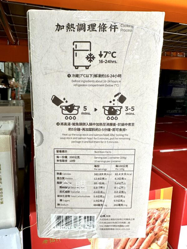 採用大西洋挪威鮭魚頭酥炸,使用沙茶和雞湯熬煮,湯頭鮮美,簡易解凍復熱,輕鬆料理。