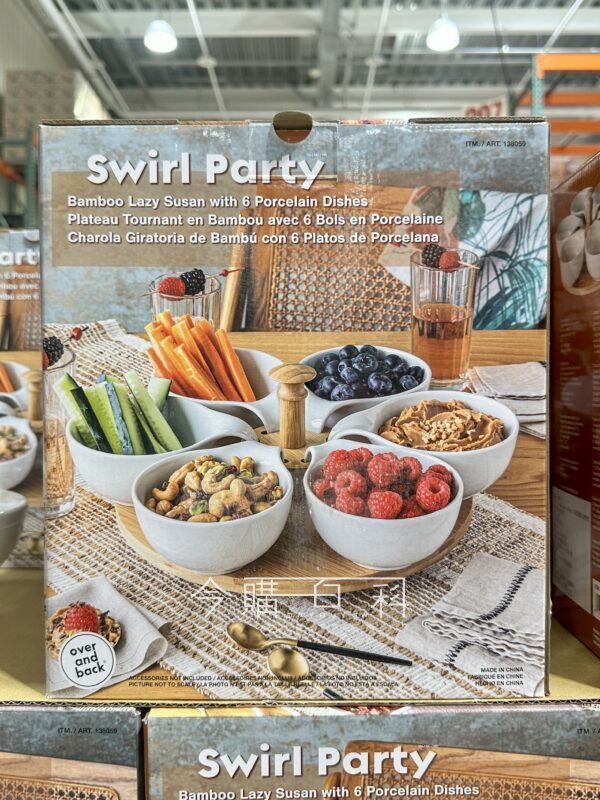 輕鬆旋轉,拿取使用方便,六格設計,分類多樣食物,可移動點心碗,簡單交換,瓷碟可耐高溫,長久耐用,木製底盤直徑約30公分,點心碟與木盤亦可分開使用,木製底盤請以手洗方式清潔,點心碟適用微波爐及洗碗機。
