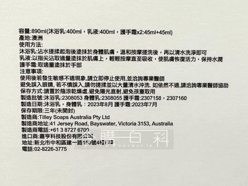玫瑰沐浴乳400ML*1、薰衣草身體乳400ML*1,滋潤肌膚,增加肌膚彈性,護手霜45ML*2(薰衣草/玫瑰),添加杏仁油、金縷梅、維生素E、乳木果油。