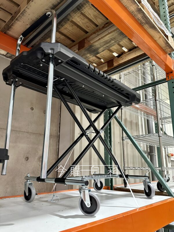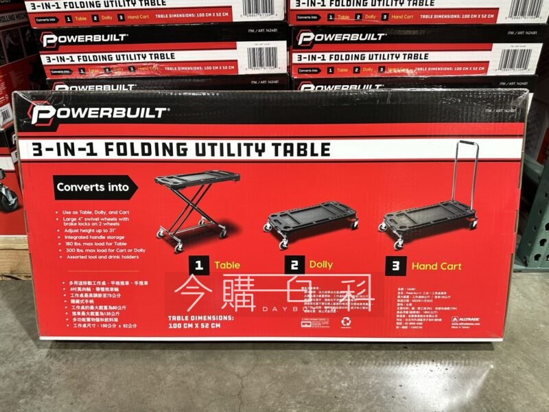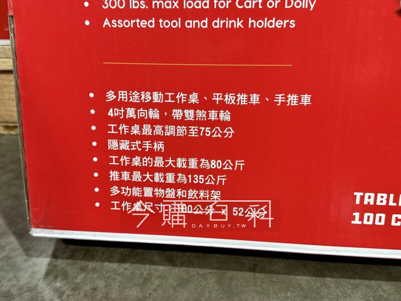 工作桌尺寸100*52公分,隱藏式手柄,多功能置物盤及飲料架,工作桌限制載重80公斤,工作桌最高調節至75公分,四吋萬向輪搭配雙煞車輪,亦可作平板推車及手推車,推車限制載重135公斤。