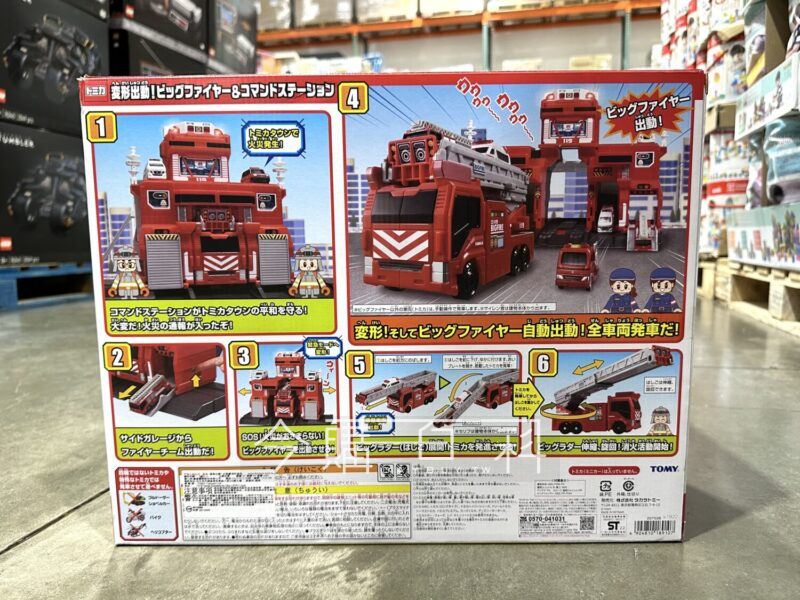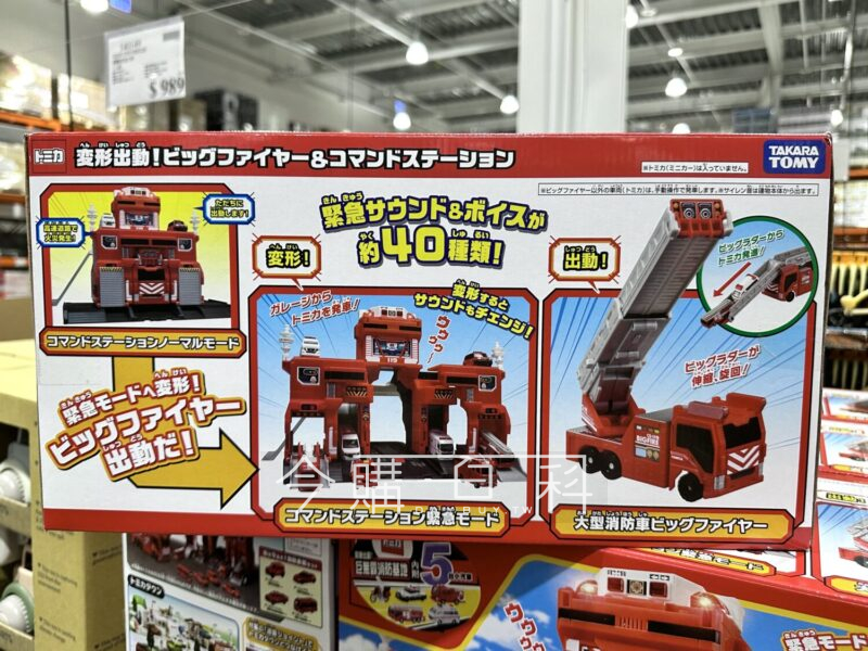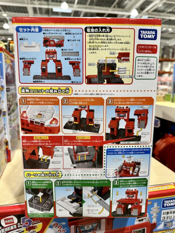 含消防基地和大消防車,搭配小汽車重現城市街景,展開大消防車頂端梯子,可搭載兩台TOMICA小車,大消防車梯子可旋轉,可搭配TOMICA道路一起玩,適用年齡:三歲以上。