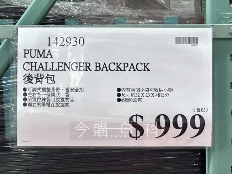 可調式襯墊背帶,含安全扣,左右各一個網狀口袋,前置拉鍊袋可放置物品,獨立的筆電存放空間,巾有兩個小袋可收納小物,尺寸約32*23*48公分,約680公克。