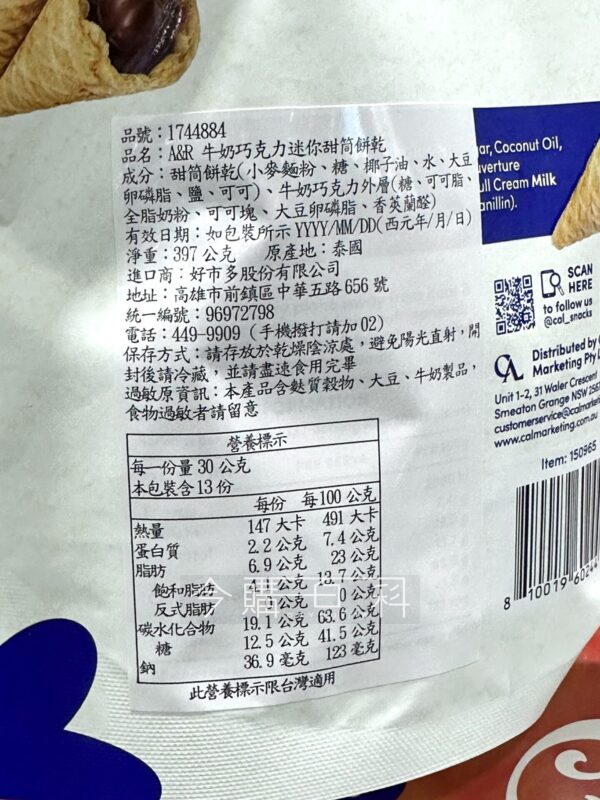 巧克力甜筒造型餅乾,濃郁巧克力搭配酥脆餅乾,適合大小朋友的可愛小點心,大小適中好入口,適合分享,原產地:泰國。