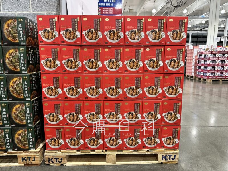 整顆鮑魚4粒,口感扎實,佐以嚴選的整朵厚實香菇,脆口杏鮑菇,鬆綿芋頭塊及自然甜綿的栗子一同熬煮,鮮甜湯頭加入豬肉慢熬細煮,常溫保存,加熱即可享用,每組約3至4人份量。