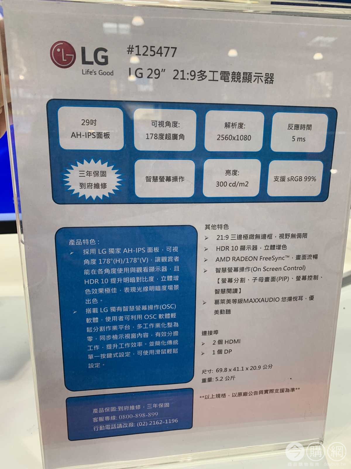 21:9三邊極致無邊框,反應時間5MS,螢幕分割/子母畫面(PIP),螢幕控制/智慧閱讀,內建顯卡RADEON FREESYNC,HDR 10/解析度2560*1080,可視角度178/178度,亮度300CD/M2/三年保固。