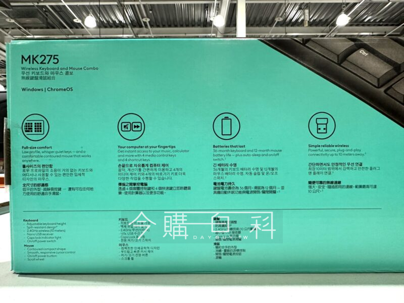 2.4GHZ無線技術,12個月滑鼠電池壽命,隨插即用的便利性,36個月鍵盤電池壽命,鍵盤上有電源切換開關,三年保固。